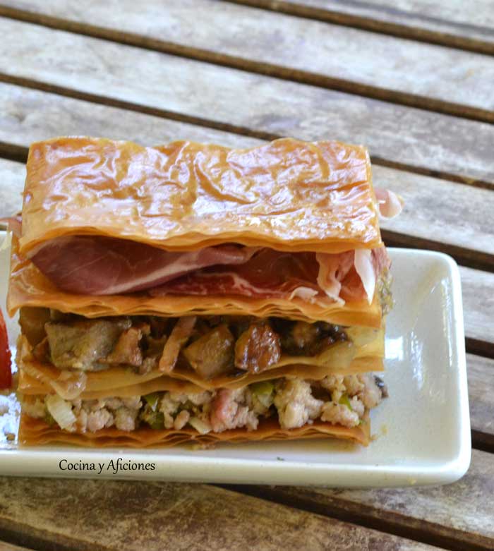 Milhojas de setas, carne y jamón Ibérico, receta paso a paso.