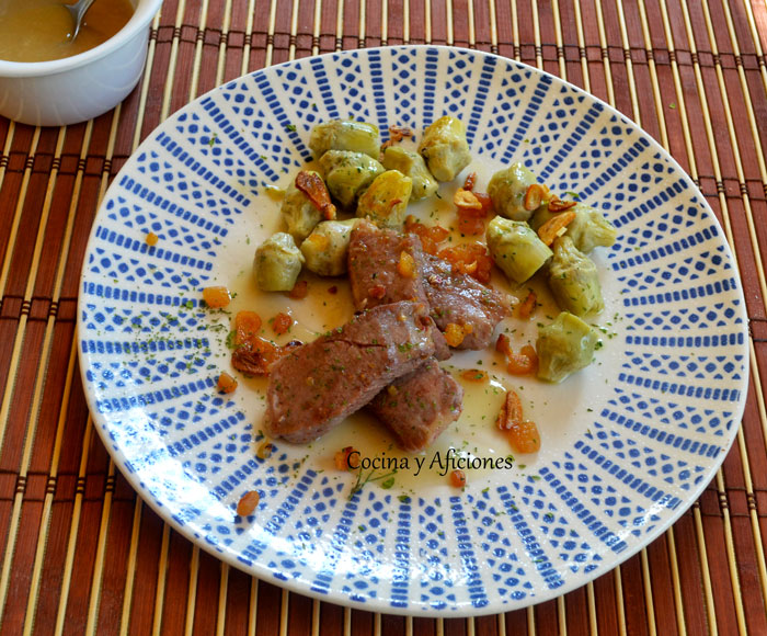 Presa ibérica y alcachofas con gel o salsa de jamón, como prefieras, de jamón. Receta de un menú de fin de verano.