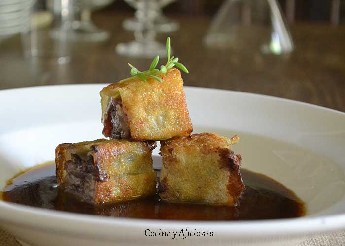 Raviolis crujientes de rabo con salsa de legumbres. Receta maridada por Jesus Flores, paso a paso