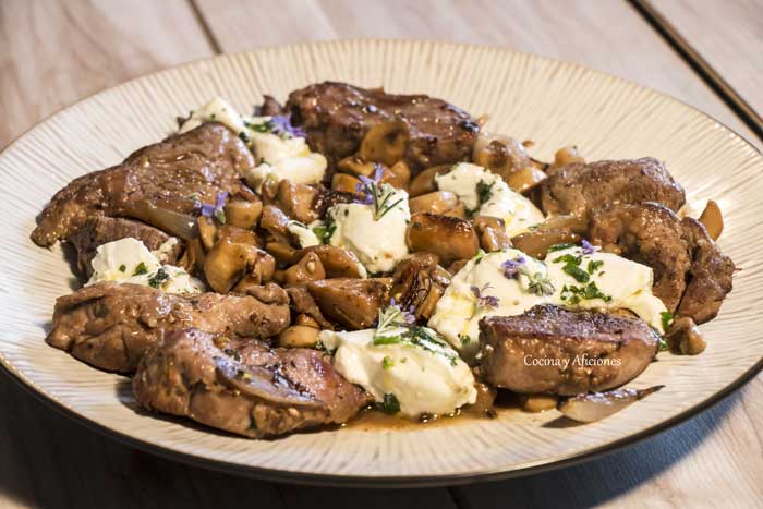 Solomillo ibérico con setas, toque de vermú y aceite ecológico del Castillo de Canena, receta con video y paso a paso.