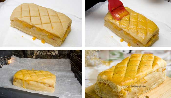 2. Tapamos con el otro rectángulo y extendemos una generosa capa de yema.