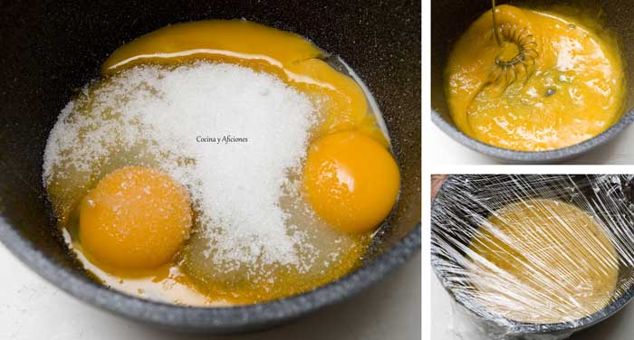 1. Colocamos en un cazo  las yemas y el azúcar,  las llevamos a fuego bajo y sin parar de mover formamos una crema, ¡cuidado!, no se tiene que cuajar.