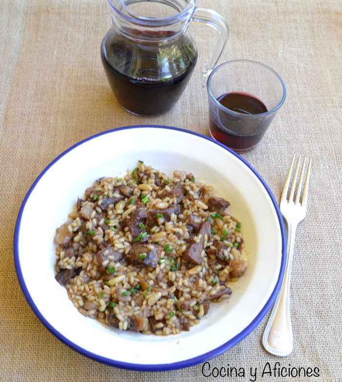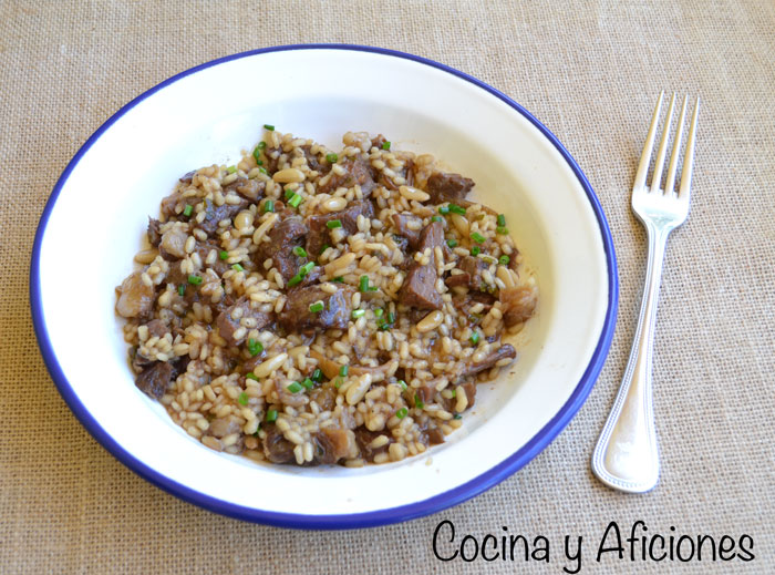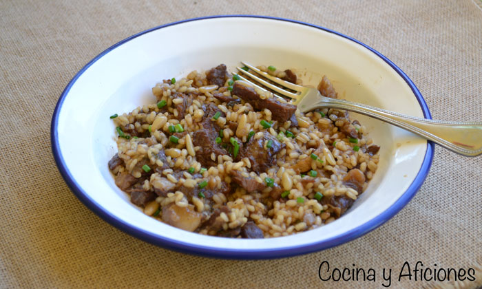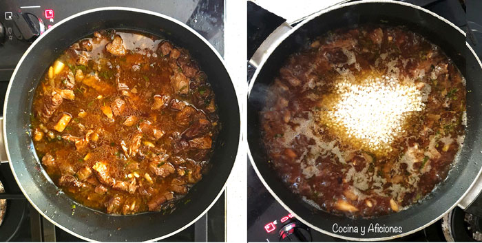 En la receta original me ponen que añada el arroz treinta minutos antes de terminar el guiso, pero todos conocemos el tiempo de cocción del arroz que siempre es mas o menos igual, además si le añadimos el calor residual del plato lo vamos a añadir a los 12/14 minutos antes de terminar la cocción de la carne, así nos quedara al dente y no pasado ni convertido en un puré.