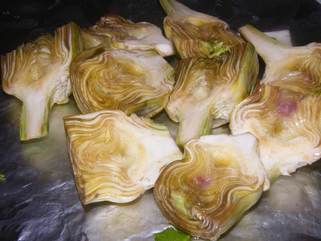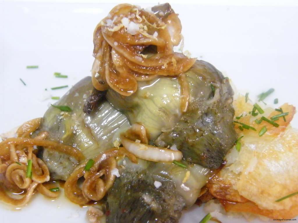 Colocamos las patas, apoyadas en ellas las alcachofas, les ponemos por encima la cebollita marinada de la vinagreta de soja. Regamos con la vinagreta y listas.