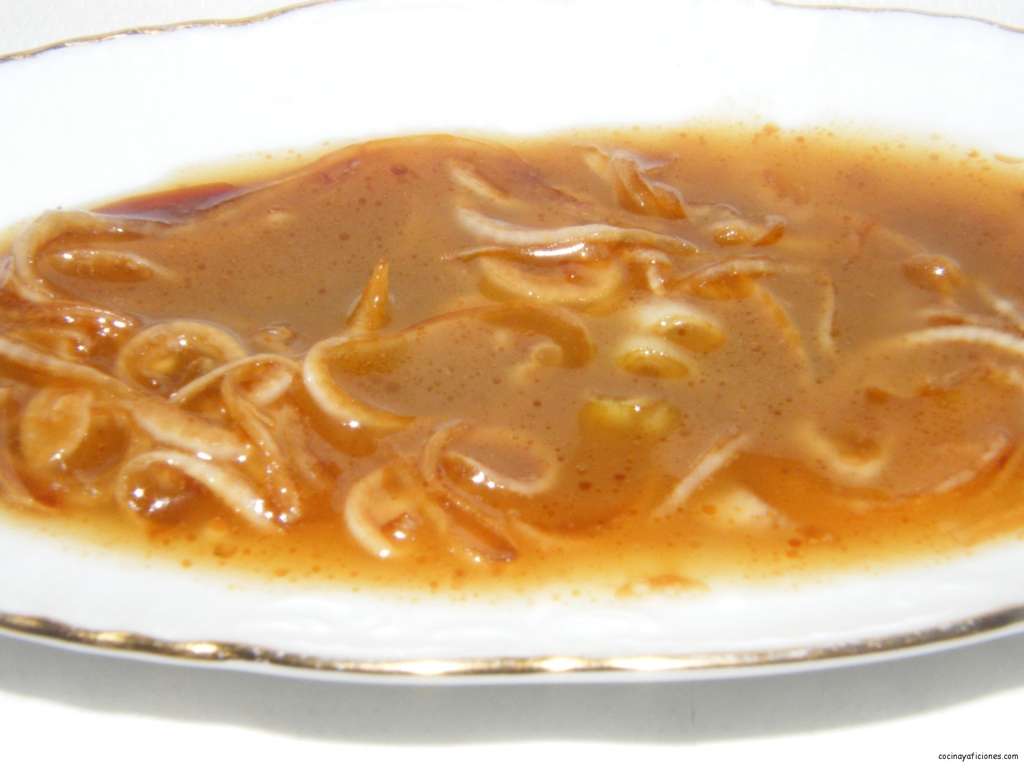 Mezclar la soja, el aceite y el vinagre con una batidora, añadir la cebolla y dejarla marinar en la nevera.