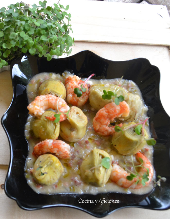 En este plato de Alcachofas en salsa con jamón y gambas vamos a utilizarlas en conserva y me diréis que estamos en temporada y que debería ponerlas naturales, creo al trasformar y conservar este rico vegetal le damos un toque diferente dándole otro sabor y otra textura, me encantan y unas buenas alcachofas en conserva son todo un lujo. Pero si quieres utilizarlas frescas no pasa nada puedes hacerlo sin problemas, solo tendrás que hervirlas y listo.