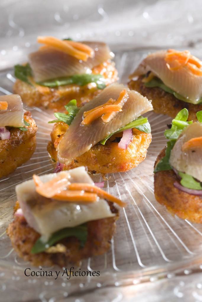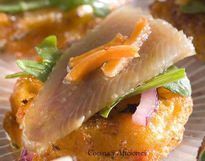 Montaje: Servirlas las torrijas con la ensalada bien escurrida y un trozo de sardina, decorar con palitos de zanahoria.