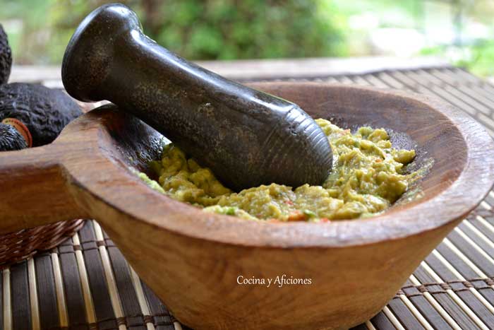 – Partimos el aguacate por la mitad, lo giramos y veras como se separa fácilmente, sacamos la pulpa y la añadimos al mortero en el que hemos machacado la cebolla y el cilantro, lo incorporamos y majamos hasta que todos los ingredientes se mezclen.