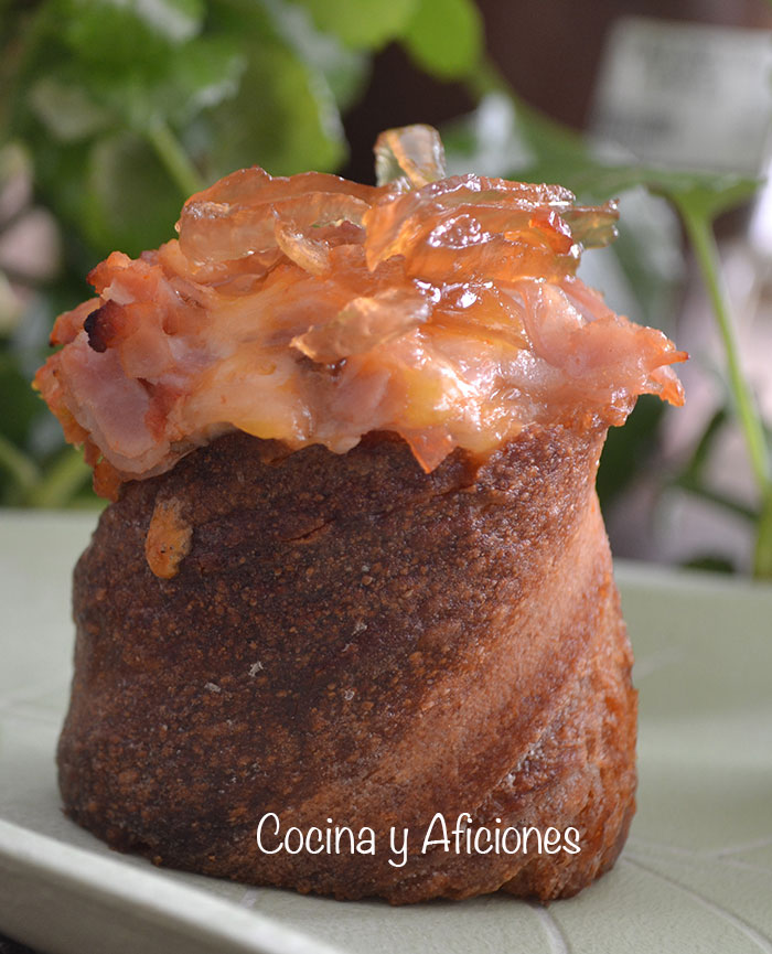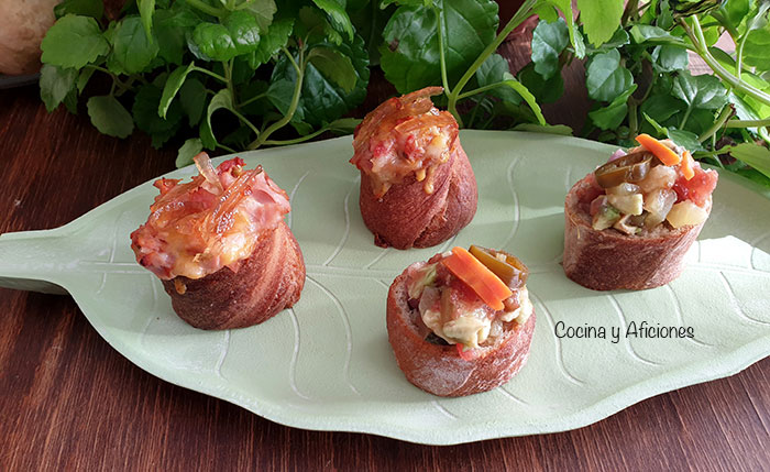 - Rellenamos con taquitos de chorizo, salchichón o jamón ibérico combinados con queso, o ponemos unas lonchas de caña de lomo o jamón como en la foto.