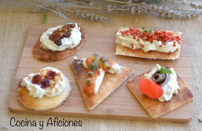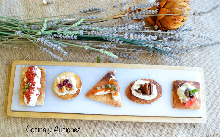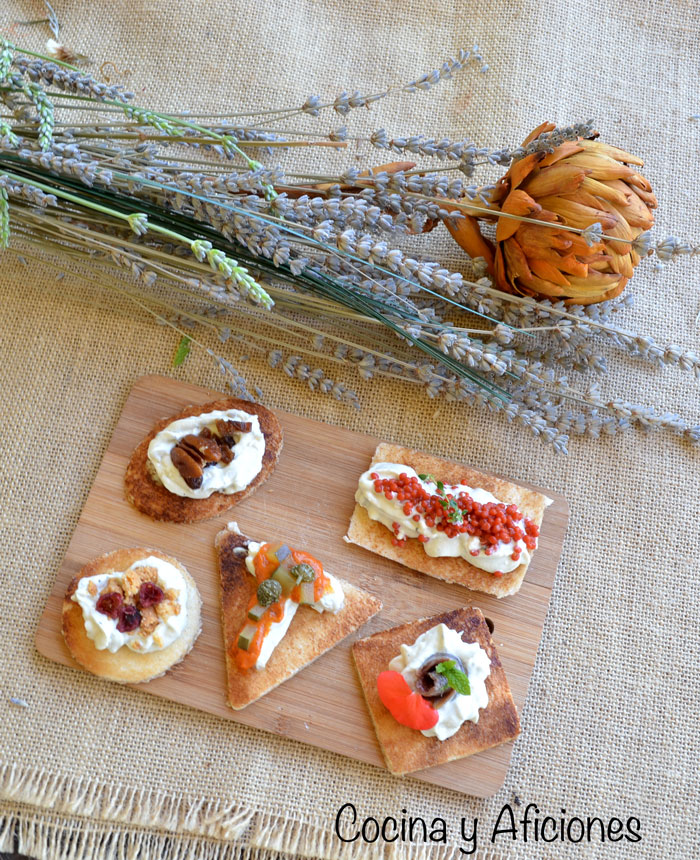 Repartimos por encima de los crostinis la mousse de queso, los acompañamos y decorados anchoas, perlas de pimentón, pepinillos, alcaparras, nueces, pétalos de flores…