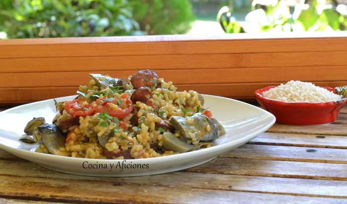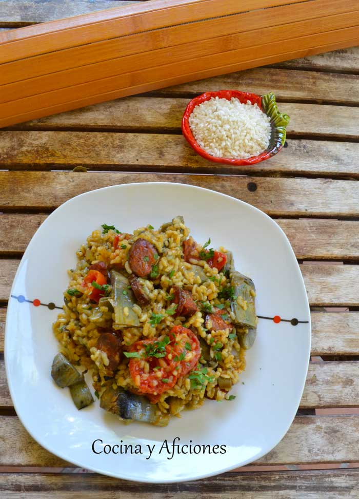 320 g de arroz sena (90 g por persona), 4 alcachofas, 1 cebolla grande, 1 c/s de perejil, 100 gr de chorizo ibérico o tu preferido, 10/12 tomates cereza, 4/5 tomates secos, 1 diente de ajo, 1 litro de caldo de pollo.