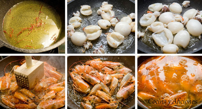 El primer paso será saltear las sepias y en la misma sárten, acto seguido, preparar el fumet de gambas, ya tenemos parte de la base del arroz, nos queda infusionar el azafrán para que suelte todas sus esencias y ponernos con el sofrito. Todos los sabores que darán forma a nuestro arroz están listos.