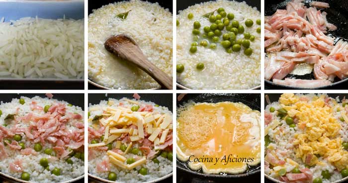 4 tazas de arroz jazmín o basmati, 4 granos de cilantro, 5 pimientas rodas, 2 vainas de cardamomo, ½ anís estrellado, 50 g de bacon, 1 huevo, 50 g de queso gouda, 2 hojas de limonero, 200 g de guisantes, Sal / Pimienta.