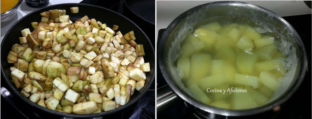 - Asar todo en horno a unos 180º C durante aproximadamente una hora. Una vez asados, extraer la carne de las berenjenas y pelar las patatas. Si no tiempo de asarlas en el horno las puedes sofreír en una serán. Este fue nuestro caso quedaron fenomenal pero es más aconsejable cocinarlas en el horno.