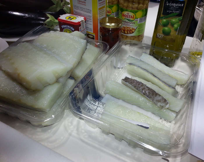 - Disponer los tacos de bacalao desalado en una cazuela amplia, evitando que se toquen entre sí. Cubrir con aceite de oliva virgen.