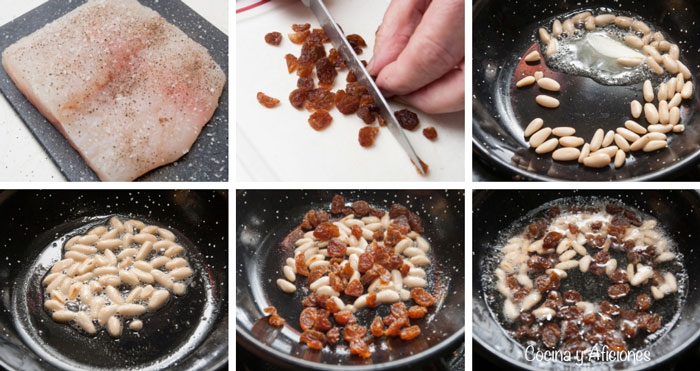 1.- Dorar los piñones a fuego lento con la nuez de mantequilla, añade las pasas picadas.