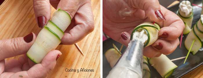 • Coger las láminas de calabacín y enrollarlas en el dedo, que te quede un tubo, contrapelo para que te quede más bonito,