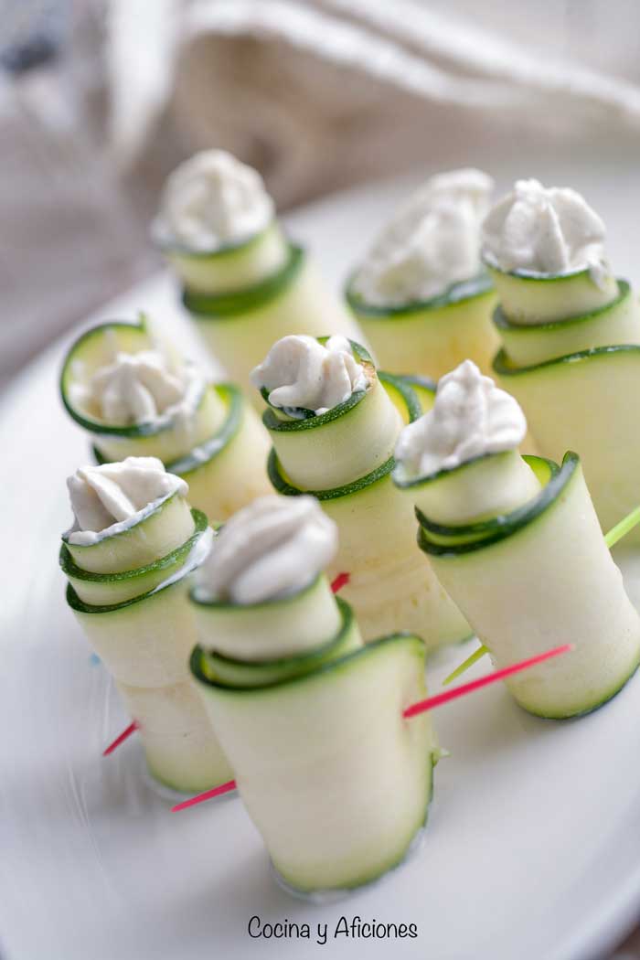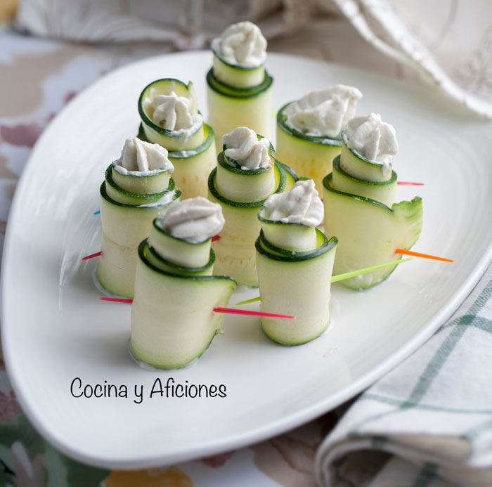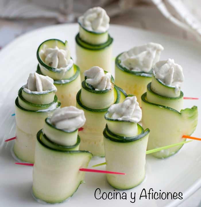 Te propongo un aperitivo fácil rápido y sencillo, se trata de unos bocaditos de carpaccio de calabacín rellenos  de una mousse de queso, cremosa y deliciosa Un dúo perfecto, el crunch del calabacín acompañado con el sabor intenso del queso, un pica, pica delicioso para compartir en los ratos de ocio acompañados de una cerveza bien fresca o un vinito blanco.