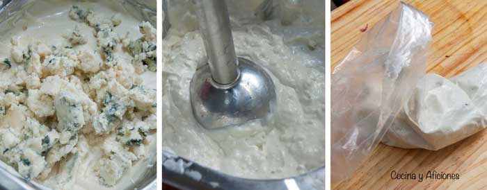 • Añadir el queso azul troceado, triturar, incorporar la pimienta y mezclamos volver a batir.