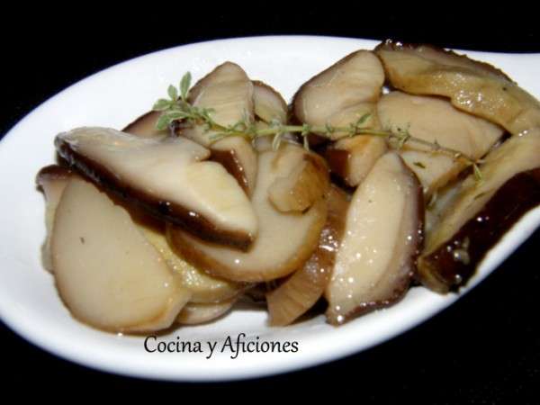 No he querido acompañar las láminas de boletus confitadas con nada y han salido unas fotos un poco sosas (sólo llevan una hierbita de adorno) pero quería  que se apreciara  como quedan y la textura que adquieren.