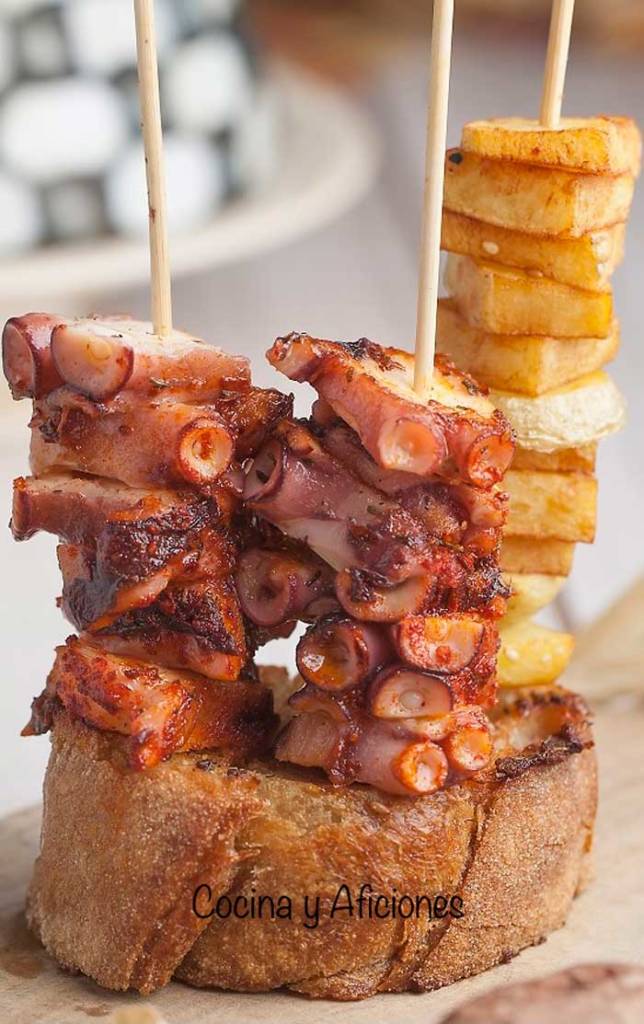 • Qué presentación tan divertida, me encanta el pulpo cocinado así, en un futuro cuando tenga una cena con amigos en casa, me acordaré de ti y lo presentaré así en brocheta.