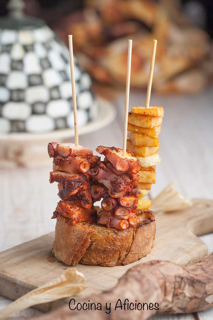 7. Presentamos para cada comensal dos brochetas de pulpo y una de patatas pinchadas en la rodaja de pan.