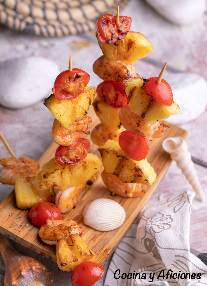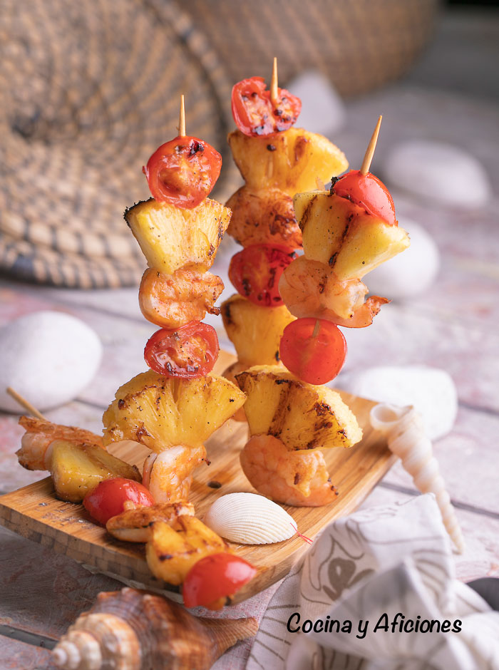 Estas brochetas de piña natural y gambas a la plancha son un aperitivo muy mono ya que tienen un colorido precioso y ya sabemos que comemos con los ojos, pero es que además están «requetericas».