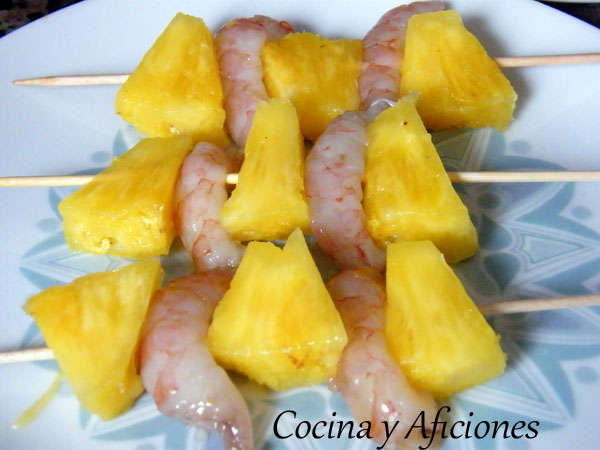 - Ensartamos los pinchos, empezamos con gamba, seguimos con piña y terminamos con tomate. Repetimos la operación.