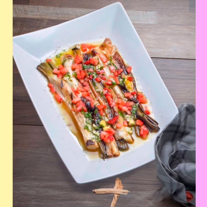 Presentación calcots al horno con su vinagreta de fresa