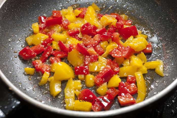 Corta en cuadrados minis los pimientos, salteados con un poco de sal hasta que estén tiernos.