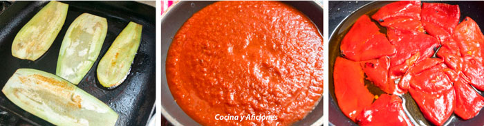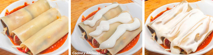 En esta ocasión los vamos a rellenar con una rodaja de berenjena, pimientos del piquillo y queso, muy sencillos pero tremendos, me han encantado ya que no se parecen en nada al resto de mis recetas de canelones.