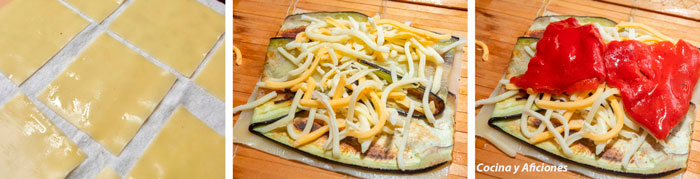 - Colocar encima de la pasta la rodaja de berenjena, encima el queso rallado y los pimientos.