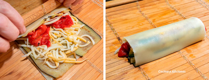 - Enrollas formando el canelón, puedes ayudarte de papel film o de una esterilla.