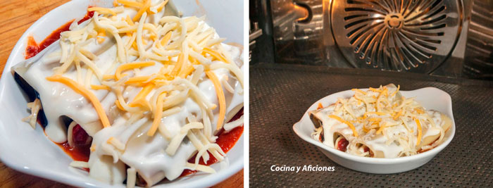 - Napar con la bechamel y repartir los quesos por encima geneosamente.