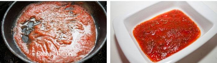 Ponemos el tomate en una sartén, añadimos el tomillo, el romero, el orégano, la sal y una pizca de azúcar. Mezclamos bien y dejamos reducir a la mitad.