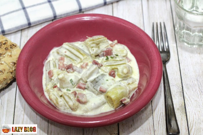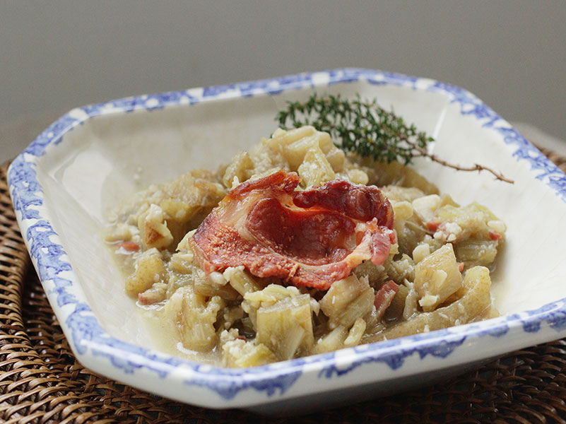 Cardo con alcachofas, jamón y salsa de queso azul