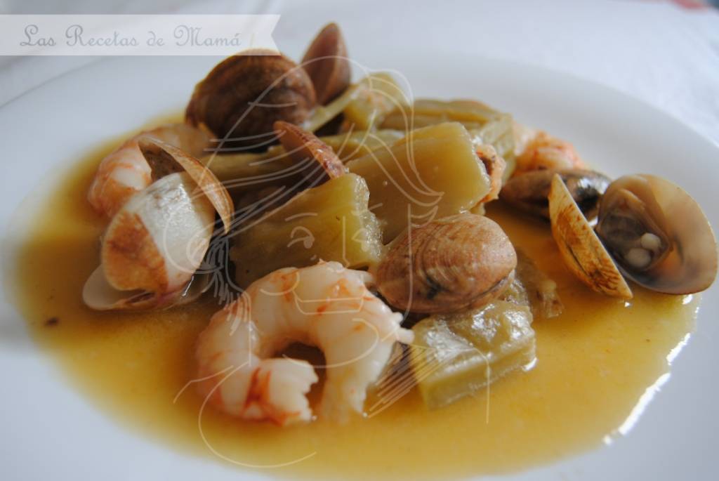Cardos con langostinos y almejas