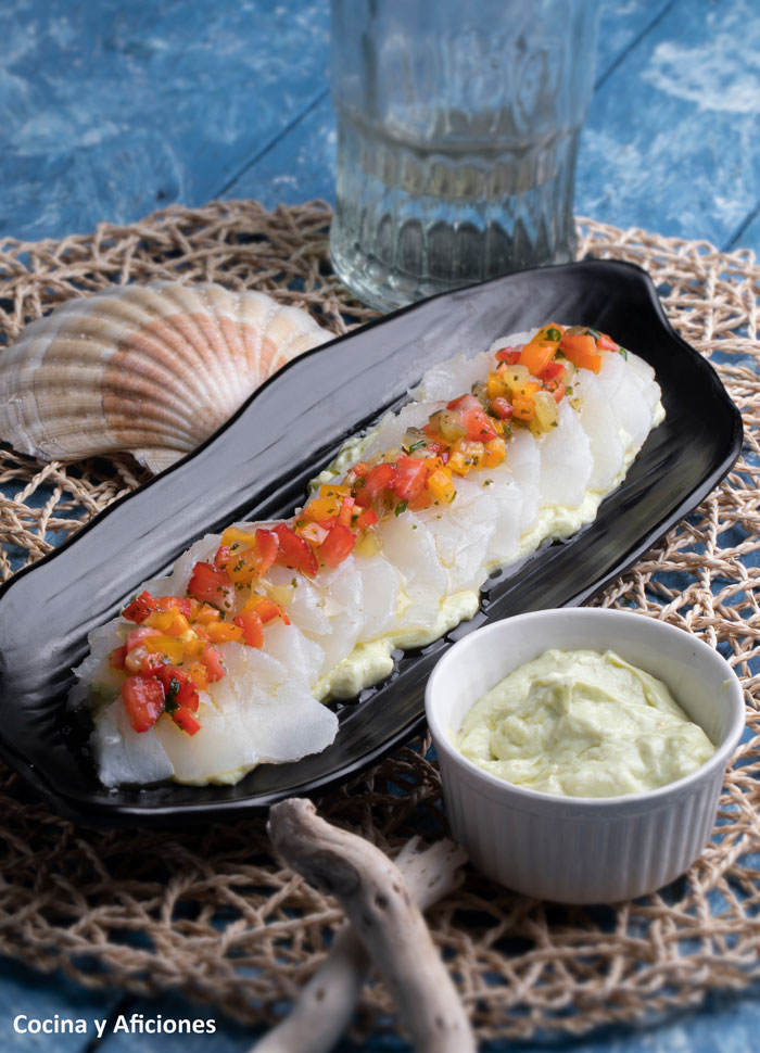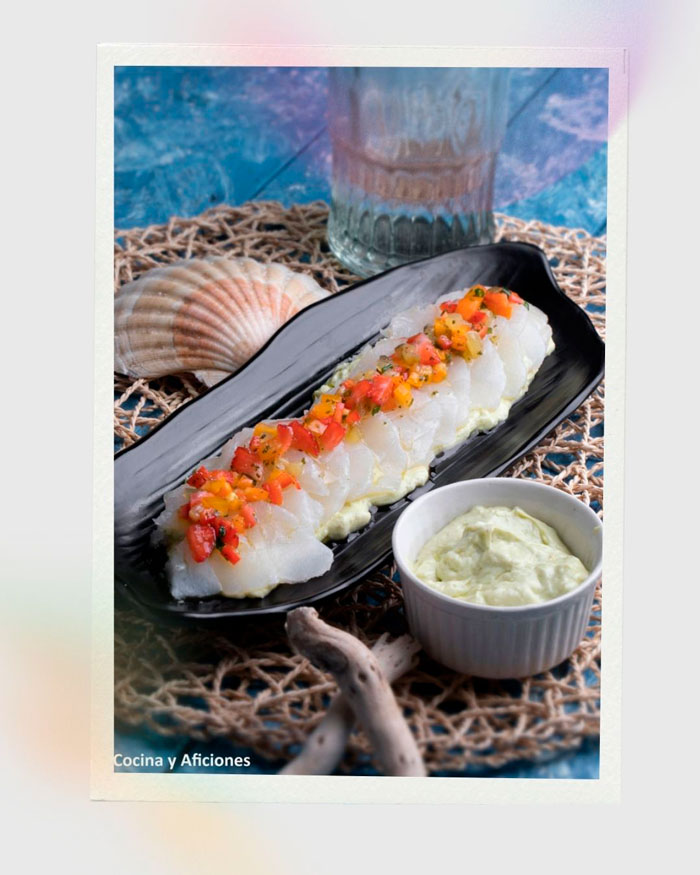 Carpaccio de bacalao sobre crema de aguacate con su picadillo canalla