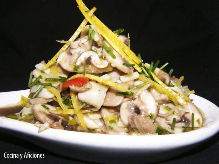 - Ponemos el champiñón con la ralladura de limón, el queso y el perejil en una hondilla (bol), le añadimos el aliño y lo mezclamos bien con las manos para que todo quede impregnado