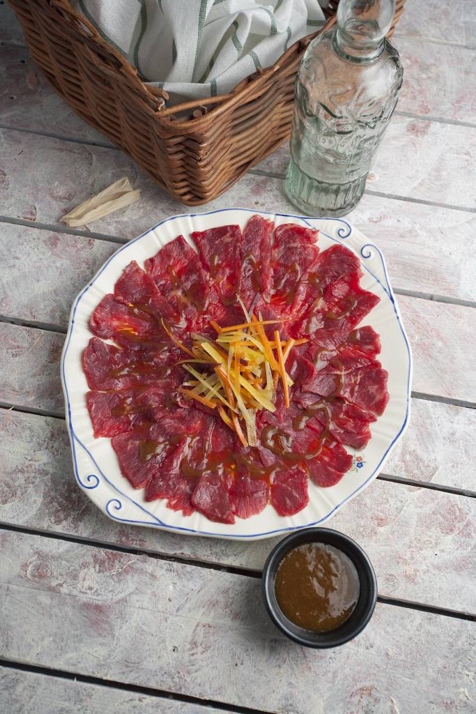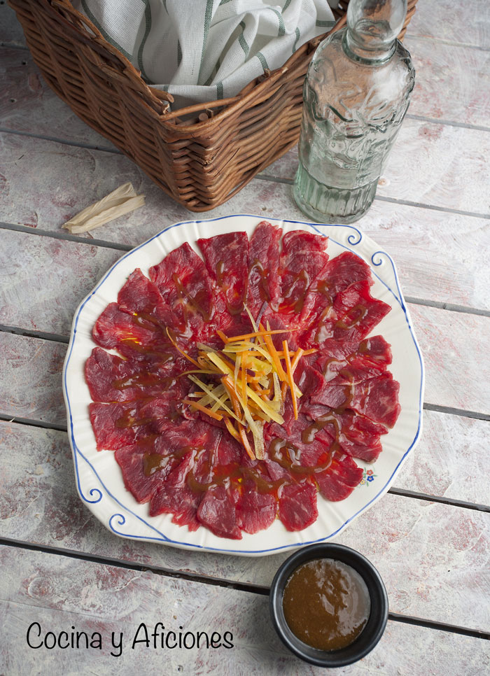 - Carpaccio con carne intensa, gel de limón y crudites de zanahoria