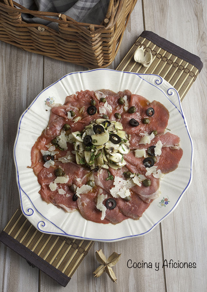 Otro carpaccio, este relleno con alcachofas minis y jamón ibérico, es delicioso y practico ya que lo puedes preparar con anterioridad quedara genial en la mesa y a tus comensales les va a encantar ya que es un plato sofisticado.