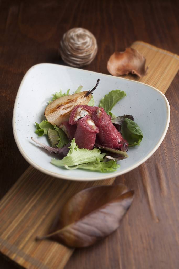 - Carpaccio de ternera relleno con pera caramelizada y queso azul de Valdeon