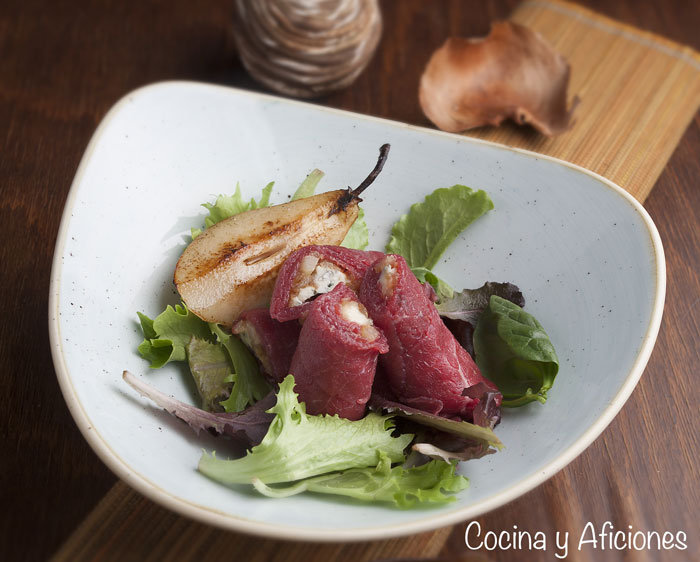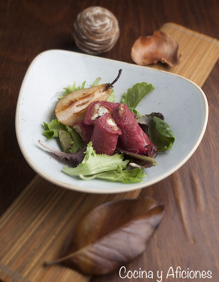 Carpaccio de ternera relleno con pera caramelizada y queso azul de Valdeon