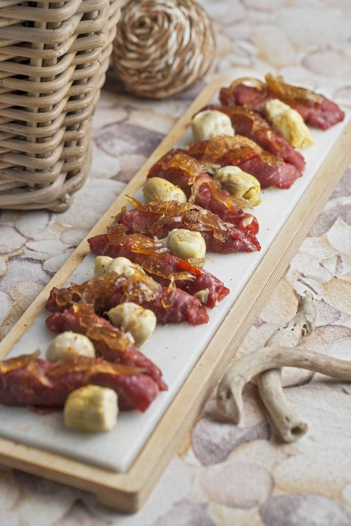 Cucharita de carpaccio de alcachofas con virutas de cecina