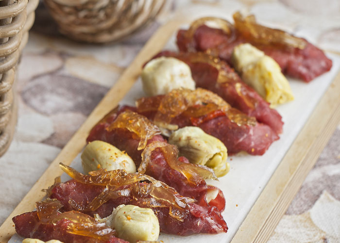 - Rollitos de carpaccio de ternera rellenos de crema de membrillo y vinagreta agridulce