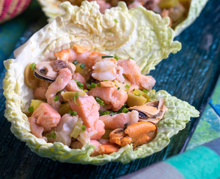 Es muy sencillo y rápido de preparar, así que no tendrás ningún problema, no hace falta que lo presentes en una hoja de col, yo lo hago por pura estética, queda genial, pero si quieres las de un cogollo serán perfectas y te quedarán unos wraps sublimes. Para hacer esta receta he utilizado salmón de Noruega.