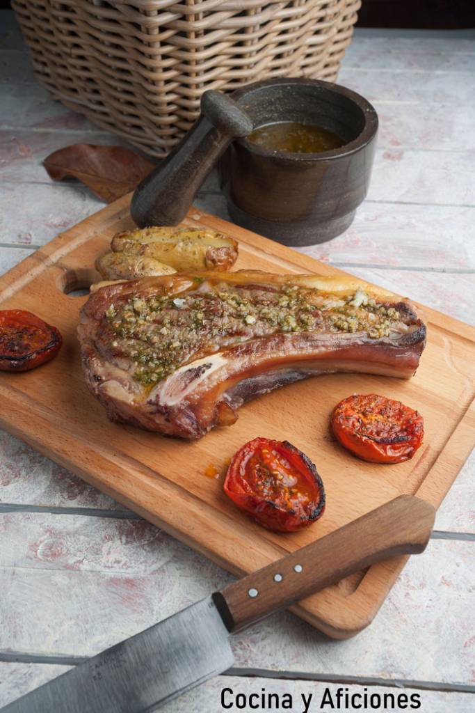 Te propongo  un plato extraordinario para tus mesas de fiesta, o simplemente para darte un homenaje, hoy nos vamos a regalar un  chuletón de vaca con chimichurri de primera,  con esta receta podrás degustar en tu casa de un tremendo chuletón, sin necesidad de parrillas y disfrutando de la comida con tus amigos y familiares ya que como se realizada en dos tiempos nos podemos permitir el lujo de dejar los fogones y comer tranquilamente.