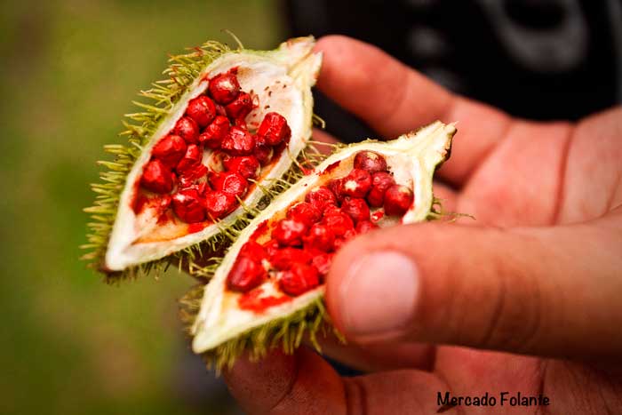 Ahora te preguntaras que es el achiote pués se trata de un arbusto que crece en México, en las zonas cálidas de los Andes y en América Central. Tiene unas semillas rojas intensas que también son conocidas con nombres como: onoto, bija, achiotl, roncón, annatto, urucú, bijol, bixina …