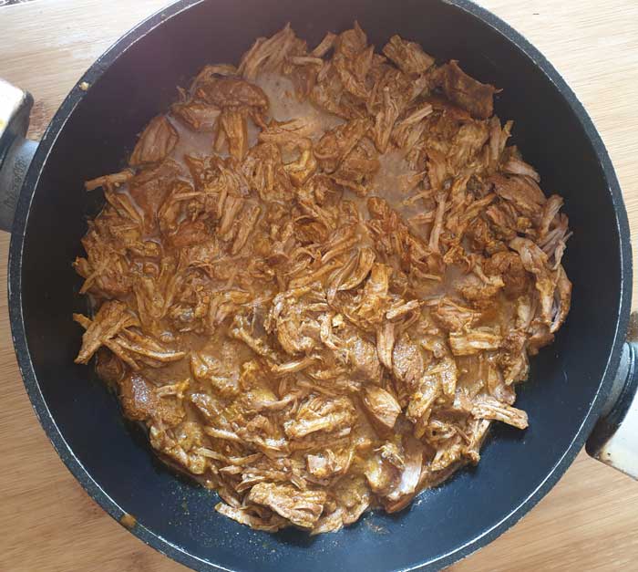 high (temperatura alta) y si vas al horno a 150ºC , siempre precalentado. Déjalo unas cuantas horas, mínimo dos que tendrás que revisar cómo va la carne. El proceso durara hasta que la carne esté tan tierna que se desmorone al tocarla con un tenedor - . Por último, deshebra y ya está lista para el montaje.