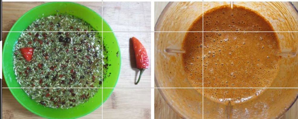 - Poner todos los ingredientes en el vaso de la batidora, dejar macerar un buen rato, y triturar hasta conseguir una pasta untuosa con todos los ingredientes perfectamente mezclados.